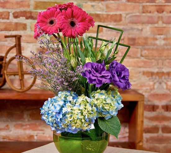 Arranjo de gerbera, lisianthus, hortênsia, latifólio e folhagem em base de vidro.